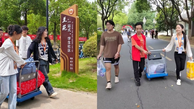 在迎新現場,黨員志愿者們堅守大門第一站,化身“紅馬甲”,以飽滿的熱情為和貼心的服務迎接來自各地的新生們,他們幫助新生搬運行李,主動與新生和家長面對面交流,介紹學校的各處設施,解答新生的入學困惑。
