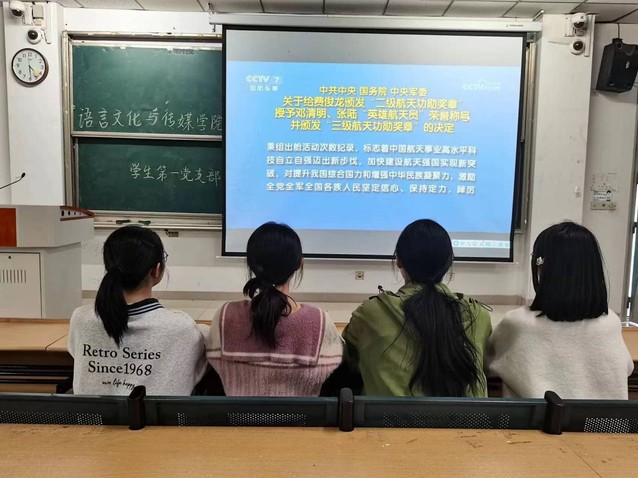 為深入學(xué)習(xí)習(xí)近平新時(shí)代中國(guó)特色社會(huì)主義思想,全面貫徹黨的二十大精神,大力弘揚(yáng)“兩彈一星”精神和載人航天精神,10月20日,語言文化與傳媒學(xué)院學(xué)生第一黨支部在善思樓c座5棟101教室召開學(xué)習(xí)會(huì)議,會(huì)議由學(xué)生副書記主持,支委成員參加。